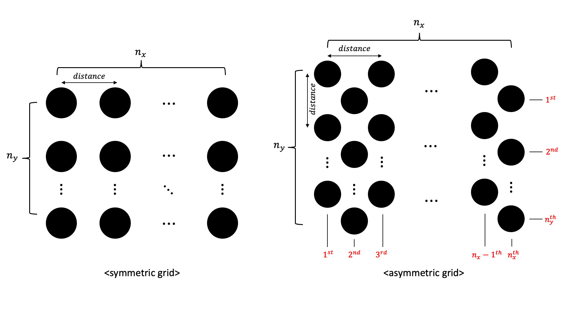 Discocal support two types of grid: symmetric and asymmetric. Be careful to set \(n_x\) and \(n_y\) of the asymmetric grid.